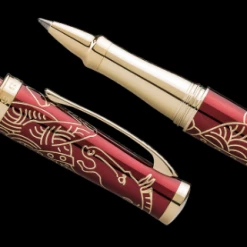 This hand-crafted pen features either a burning red finish that reflects the desire for success and good fortune, or a beautiful shimmering white finish that reflects the confidence and strength of character that defines everyone born under this sign. With deep cut engraving and 23 karat gold plated overlays, this animated instrument stampedes across the page illuminating each idea it transfers to paper.