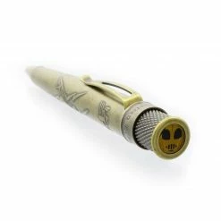 Taken directly from the cover of The Rocketeer Adventure Magazine #1, this beautiful stonewashed brass rollerball pen features an acid-etched image of The Rocketeer blasting off on the barrel! The character is framed by four lightning bolts with the classic logo above. The top disc features The Rocketeer’s face from his iconic helmet. Each pen is numbered on the top ring and packaged in a graphic tube featuring a collage of pages straight from the comic book!