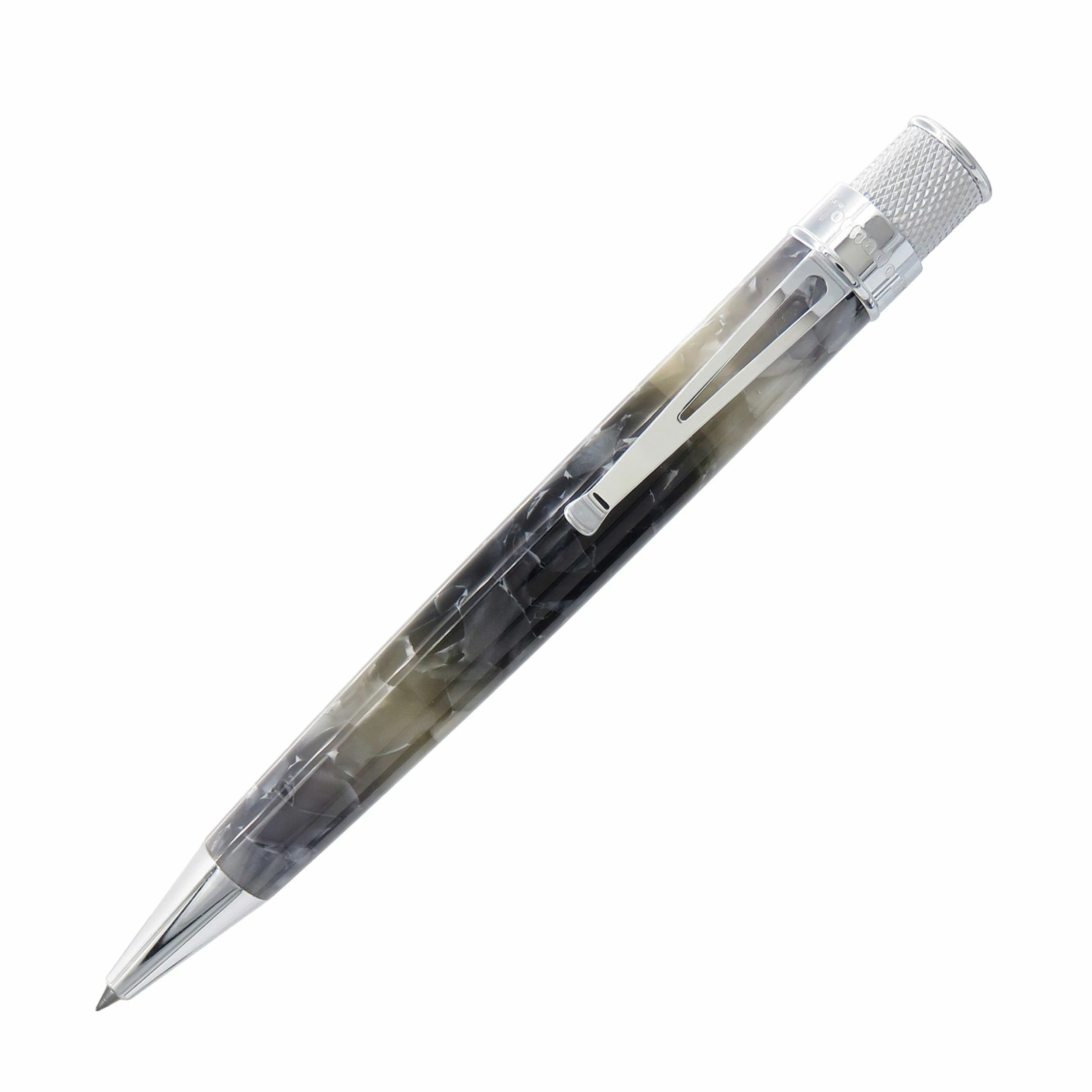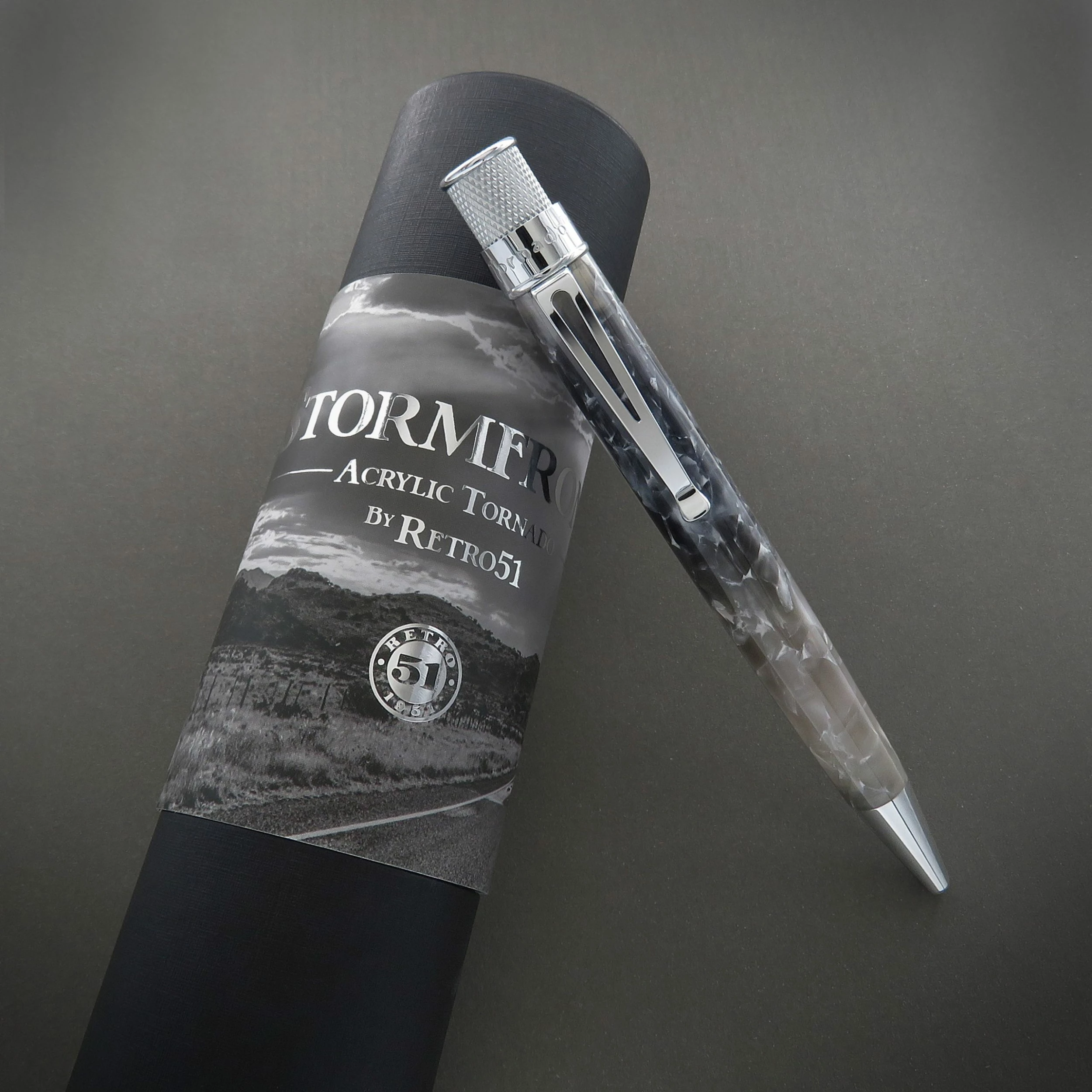 The acrylic barrels with supercell pattern are polished to a gloss finish and complete with chrome accents. Each one is loaded in packaging featuring B&W photography by Retro51 collector Mike Gfeller with silver foil embellishments.
