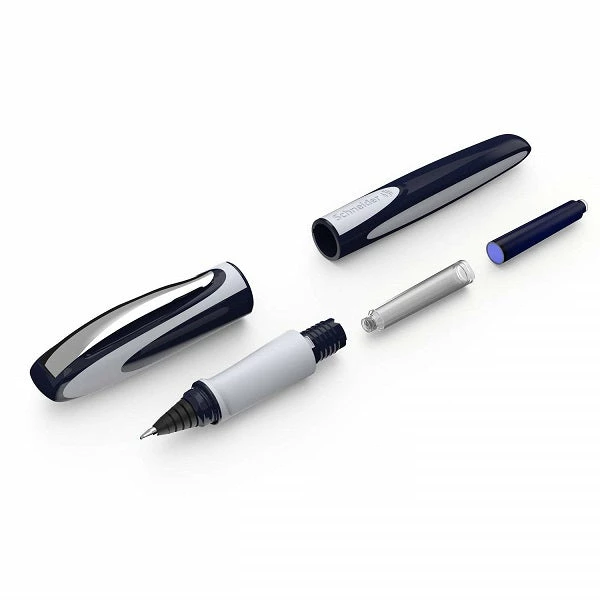 Schneider’s Ray Cartridge Rollerball Pen features a modern design barrel and a rubberized grip for comfortable writing. This pen has a wear-resistant stainless steel tip (Medium). The barrel color is deep blue and light grey. The pen contains one royal blue standard ink cartridge and is refillable with any “international size” fountain pen ink cartridge