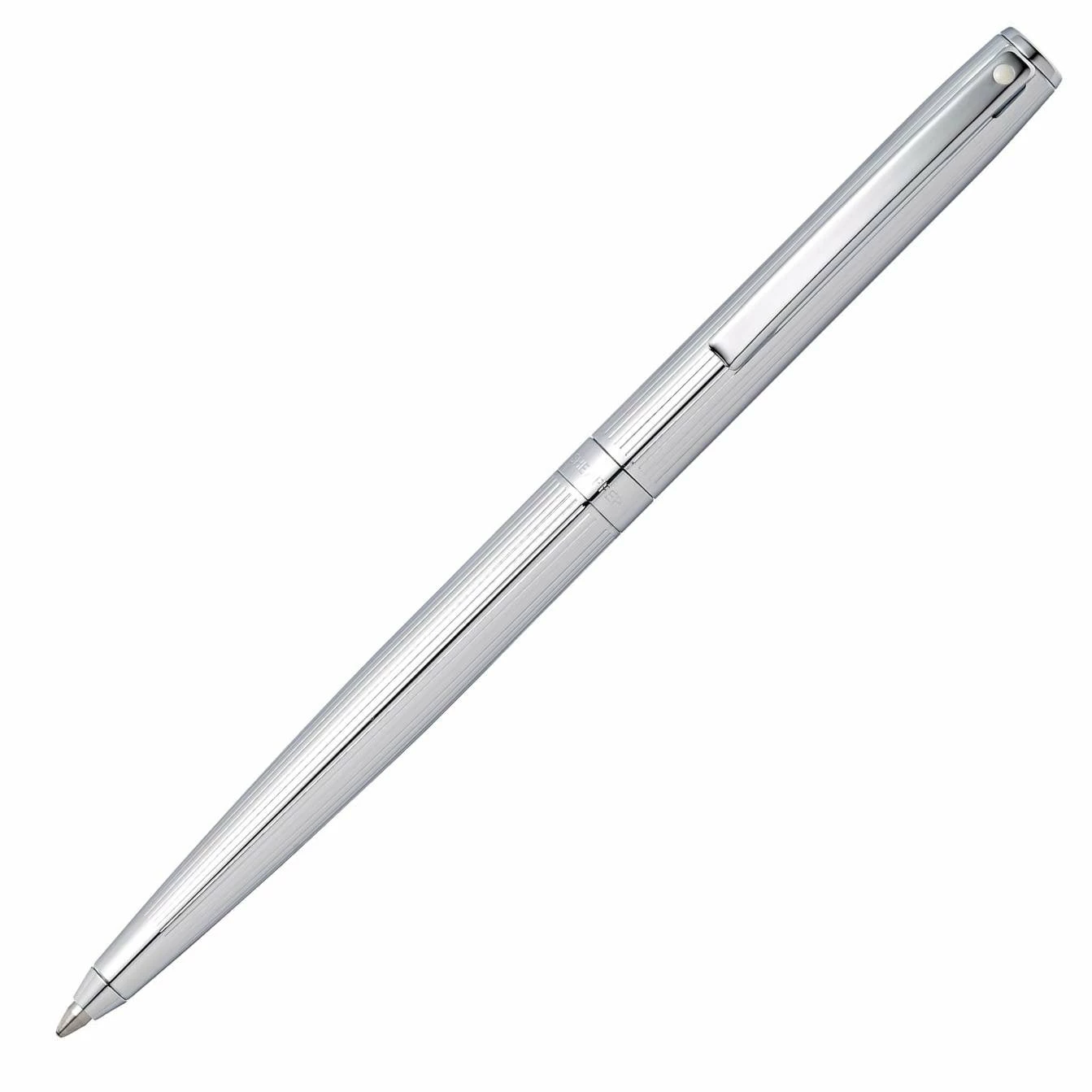 This Sagaris ballpoint pen by Sheaffer is rendered with an awe-inspiring appearance, crafted with a classically designed silhouette. The pen features a fluted chrome barrel and chrome plated accents, giving the pen a sense of luxury and executive style.