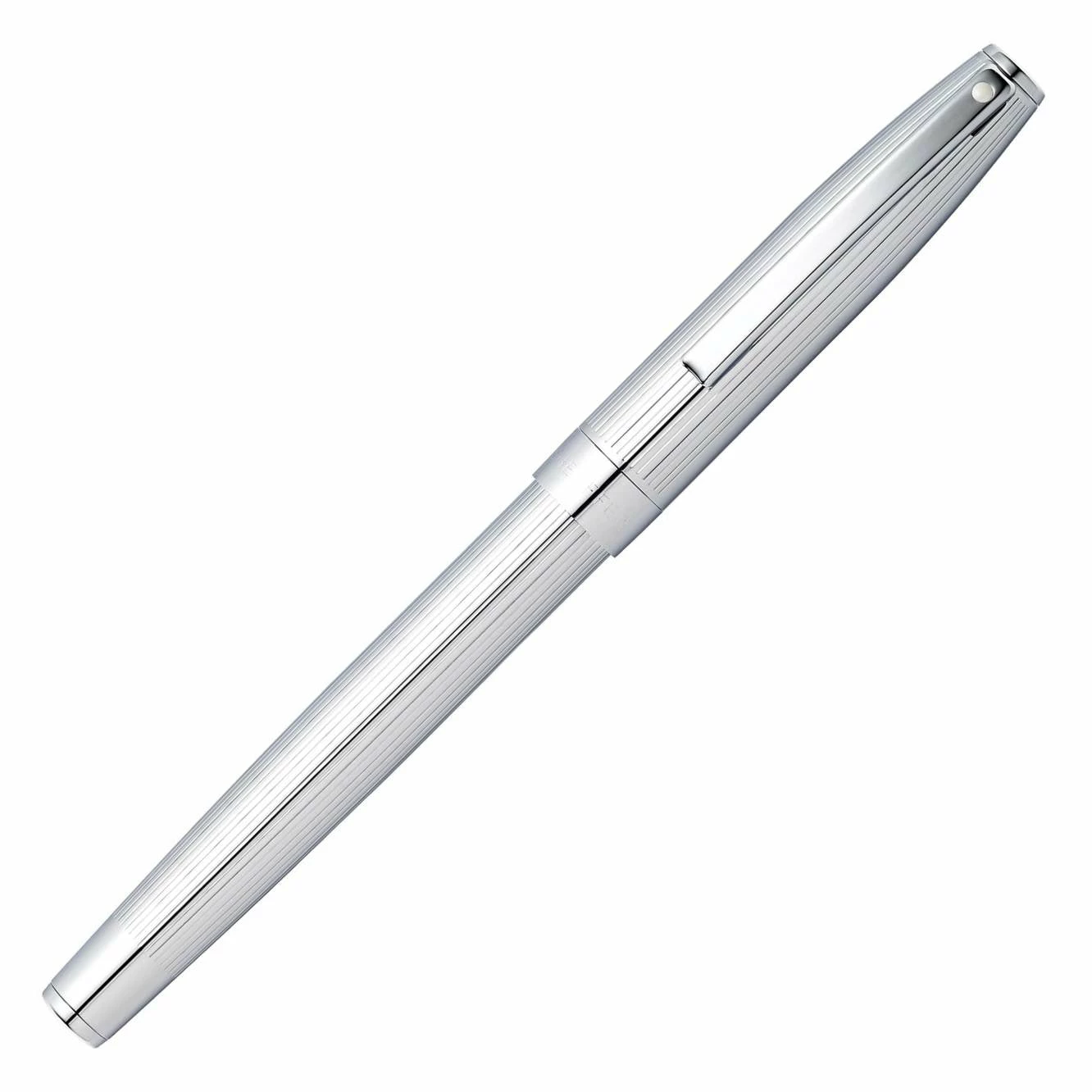 This Sagaris rollerball pen by Sheaffer is rendered with an awe-inspiring appearance, crafted with a classically designed silhouette. The pen features a black cap chrome barrel and gold plated accents, giving the pen a sense of luxury and executive style.