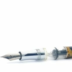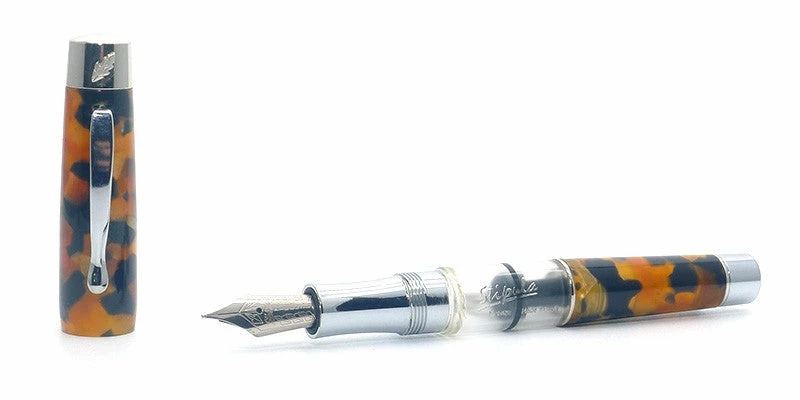 Stipula 22 is a wonderful pen made in acrylic resin turned by hand in different colors. This pen is made of brown, gold and black with a hint of some red. As with all resins, colors and patterns will vary.