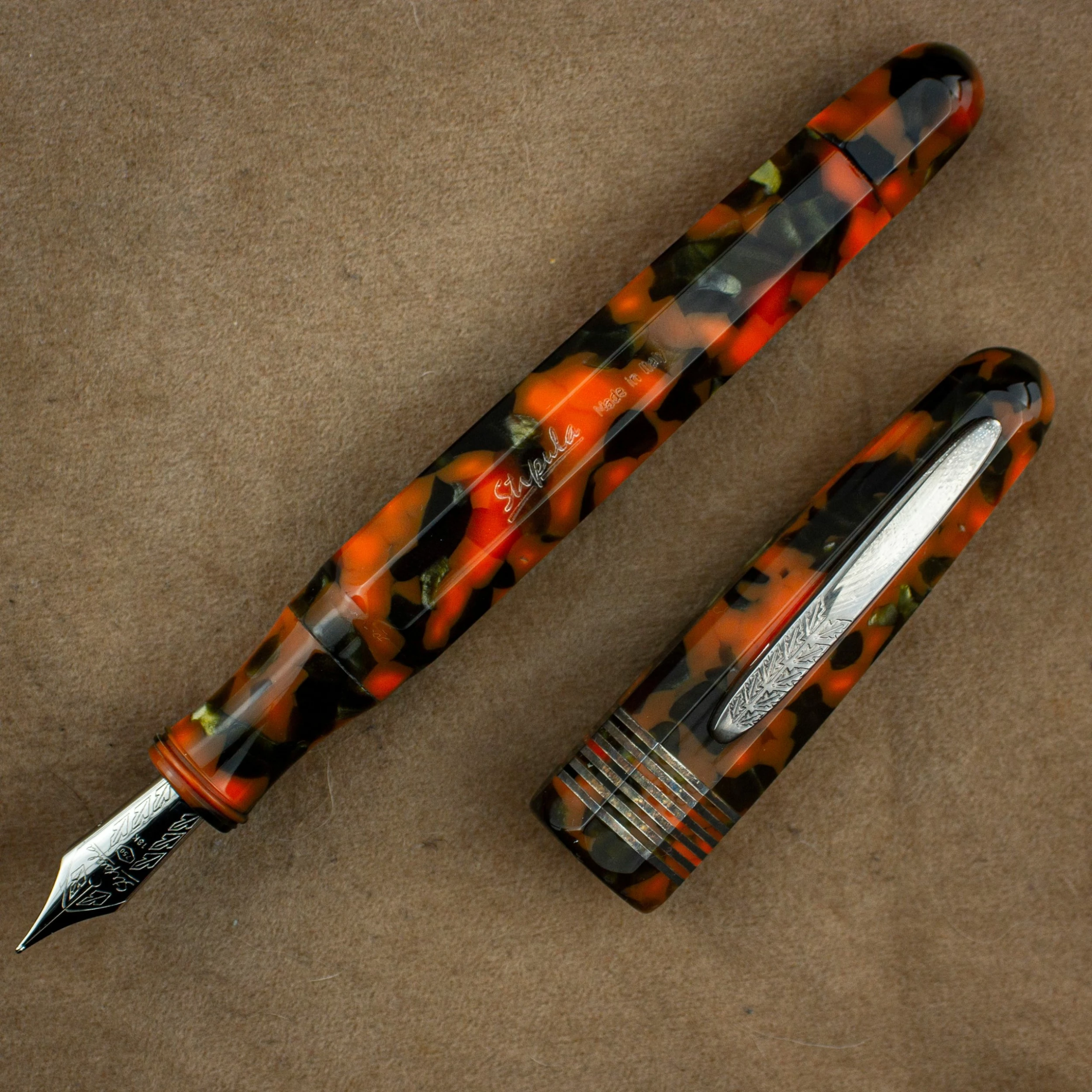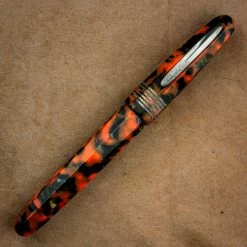 The Stipula Etruria Faceted fountain pen features a distinctive resin mixing orange with black and small pockets of bronze with a section that matches the barrel/cap. The Stipula Etruria Faceted Passion Fruit LE is a numbered edition.